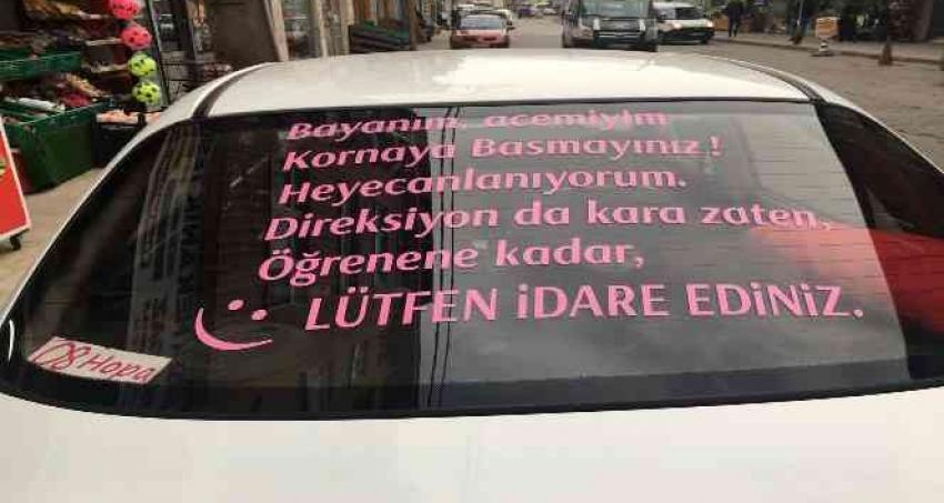 Sürücü adayı eşi için arabasının arkasına yazdığı yazı görenleri güldürüyor