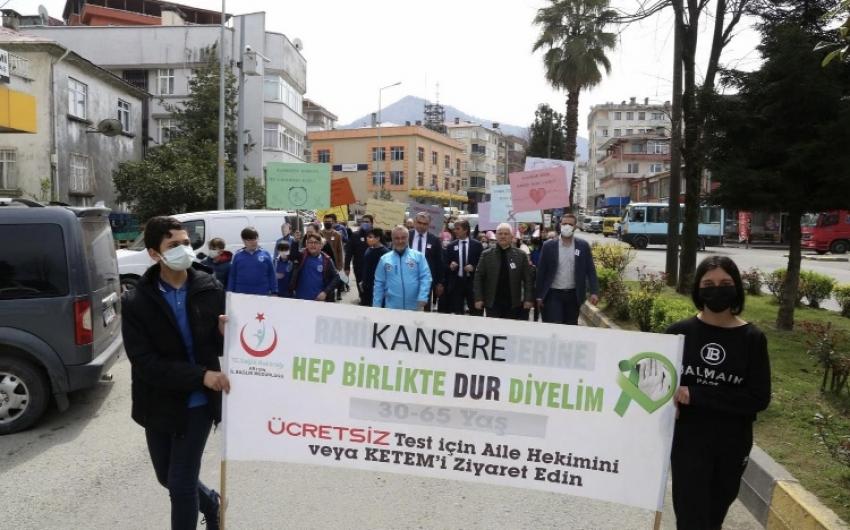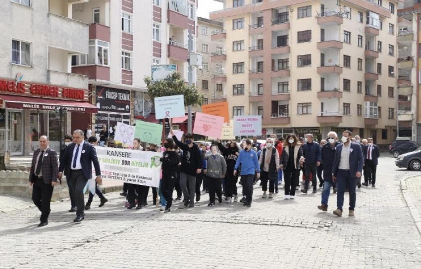 “Kansere Hep Birlikte Dur Diyelim” sloganıyla FSM Ortaokulu’ndan başlayan yürüyüşte öğrencilerin hazırladıkları pankart ve dövizler dikkat çekti. Yürüyüş ilçe merkezinden geçilerek Toplum Sağlığı Merkezi önünde tamamlandı.